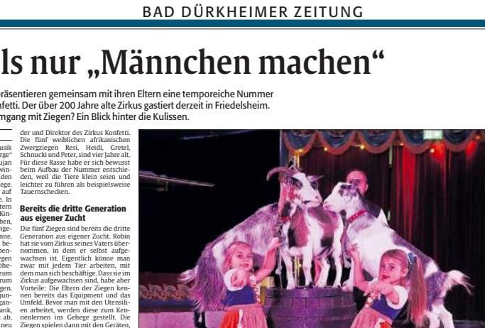 Jaylee und Lujan Frank präsentieren gemeinsam mit ihren Eltern eine temporeiche Ziegennummer im Zirkus Konfetti….